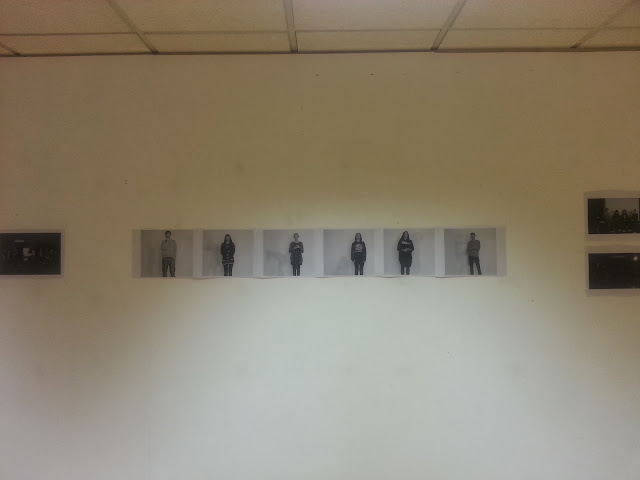 I presented two elements of my work that I think caused confusion without explanation. To the left and right of the central piece featured a documentation of the meditative part of the workshop of which illustrated a grouping of people and the contrast observations were made between theses and individual shots in that they interpreted the interactive behaviour of people within groups and on their own. However the viewers then acknowledged the representation of identity in the work especially in the central work which was clear.